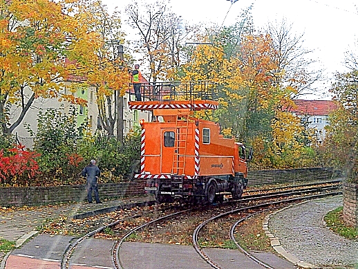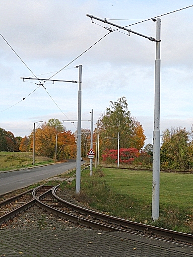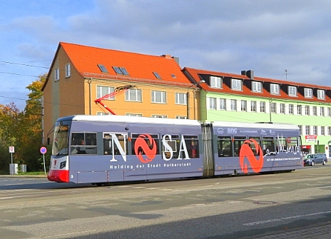 TW 5 an der Einfahrt zum Betriebshof der Halberstädter Straßenbahn
